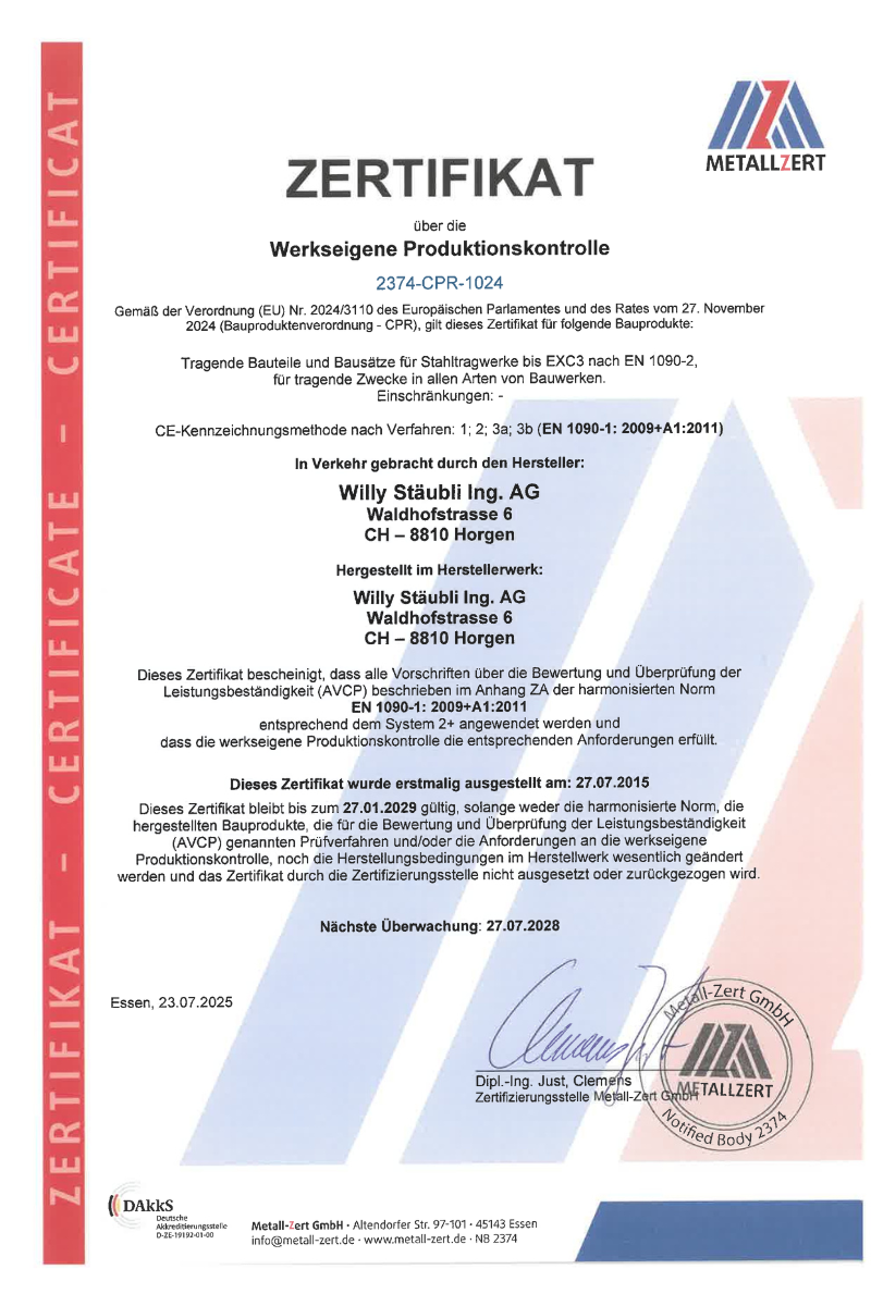 Implementiamo e produciamo strutture in acciaio sulla base della norma EN 1090 e i nostri processi ottimizzati garantiscono la tracciabilità lungo l'intera catena del valore in ogni momento. Il controllo interno della produzione e le certificazioni valide sottolineano i nostri elevati standard di qualità orientati al cliente. Di conseguenza, tutti i nostri saldatori sono regolarmente testati e ricertificati in conformità alla norma applicabile per le costruzioni in acciaio EN ISO 9606-1 e alla norma per l'acciaio di rinforzo EN ISO 17660-1.
