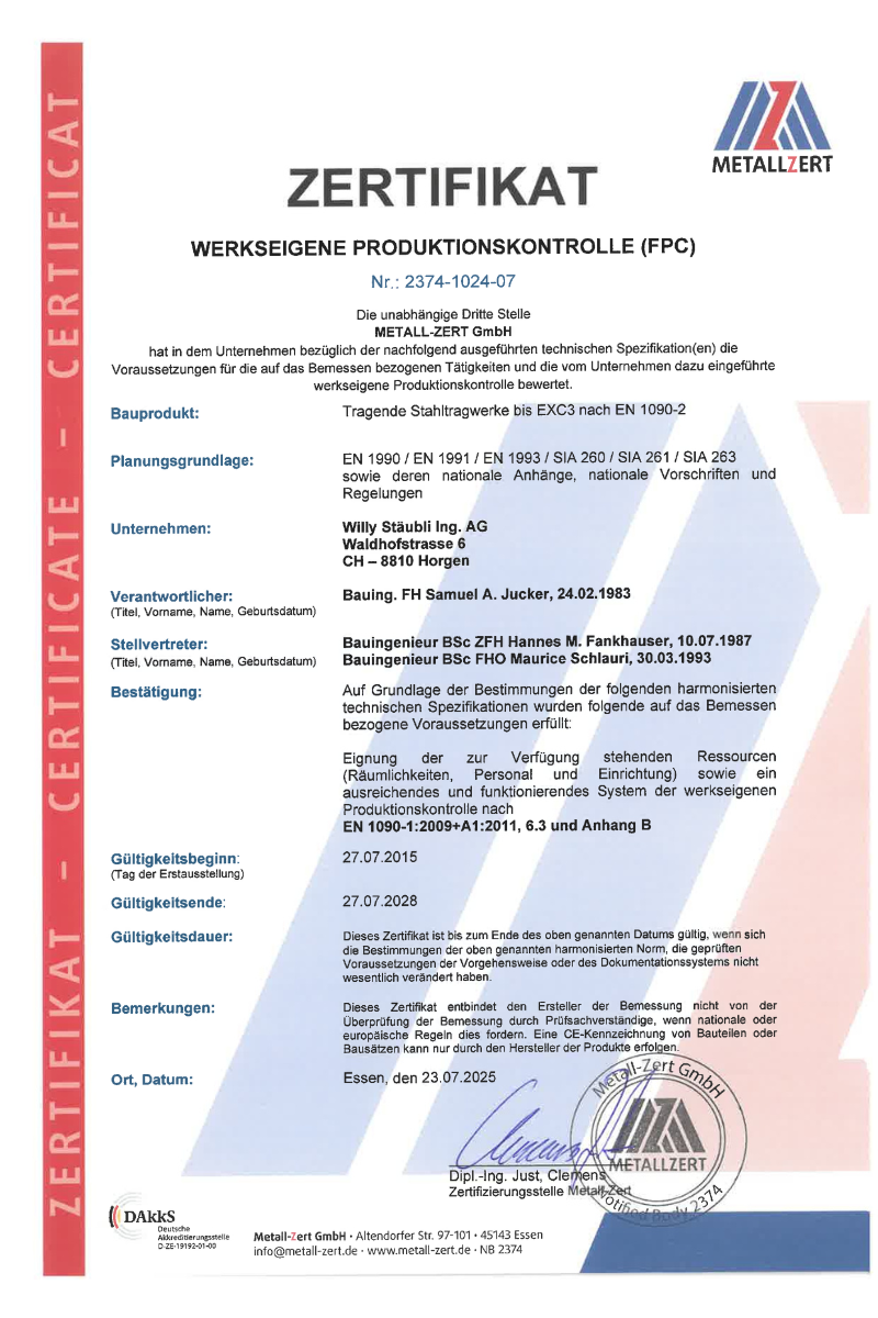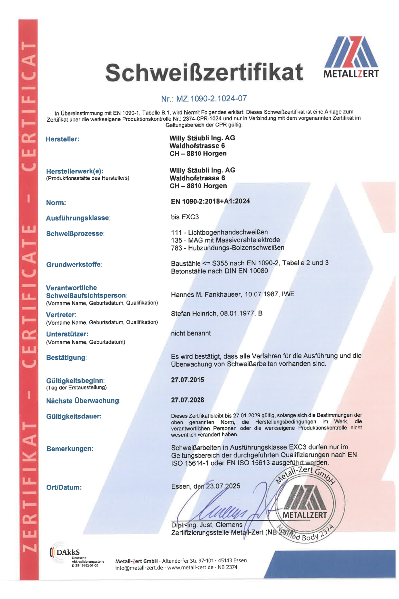 Die Realisierung und Fertigung im konstruktiven Stahlbau erfolgt bei uns auf Grundlage der Norm EN 1090. Anhand unserer optimierten Prozessabläufe ist eine Rückverfolgung der gesamten Wertschöpfungskette jederzeit gewährleistet. Die werkseigene Produktionskontrolle und gültige Zertifizierungen unterstreichen unseren hohen kundenorientierten Qualitätsanspruch. Dementsprechend werden alle unsere Schweisser regelmässig geprüft und nach der geltenden Stahlbaunorm EN ISO 9606-1 bzw. nach der Betonstahlnorm EN ISO 17660-1 rezertifiziert.